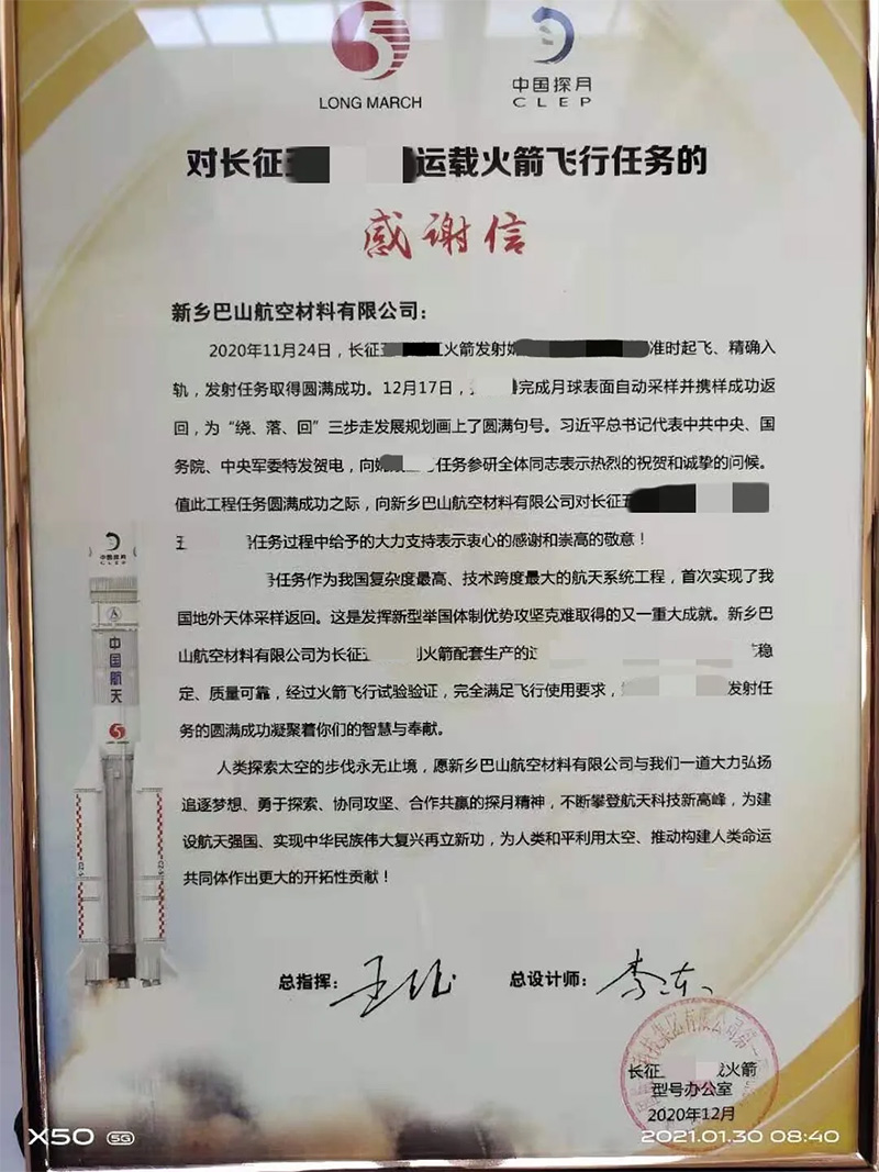 近日,新鄉巴山航空材料有限公司收到運載火箭型號辦公室發來的感謝信,信中對我公司為某運載火箭飛行任務做出的貢獻表達了感謝。