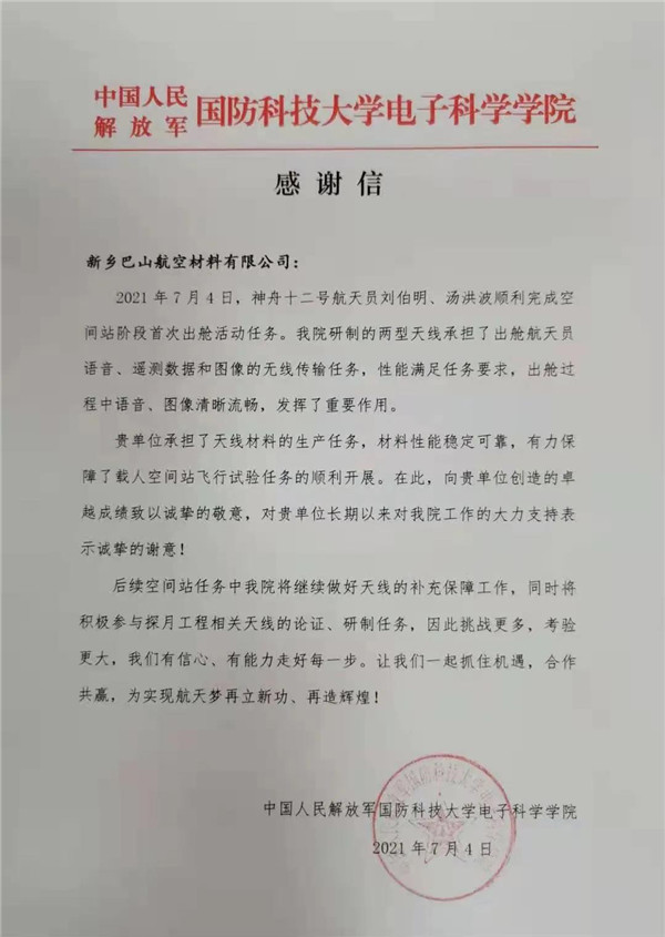 在此次發射任務中,我公司配套的某材料成功應用于空間站天線裝置,材料性能穩定可靠,有力保障了載人空間站飛行試驗任務的順利開展。近期,中國人民解放軍國 防科技大學為我公司發來感謝信。信中稱,向我公司創造的成績致以誠摯的敬意,對我公司長期以來對其工作的大力支持表示誠摯的謝意!